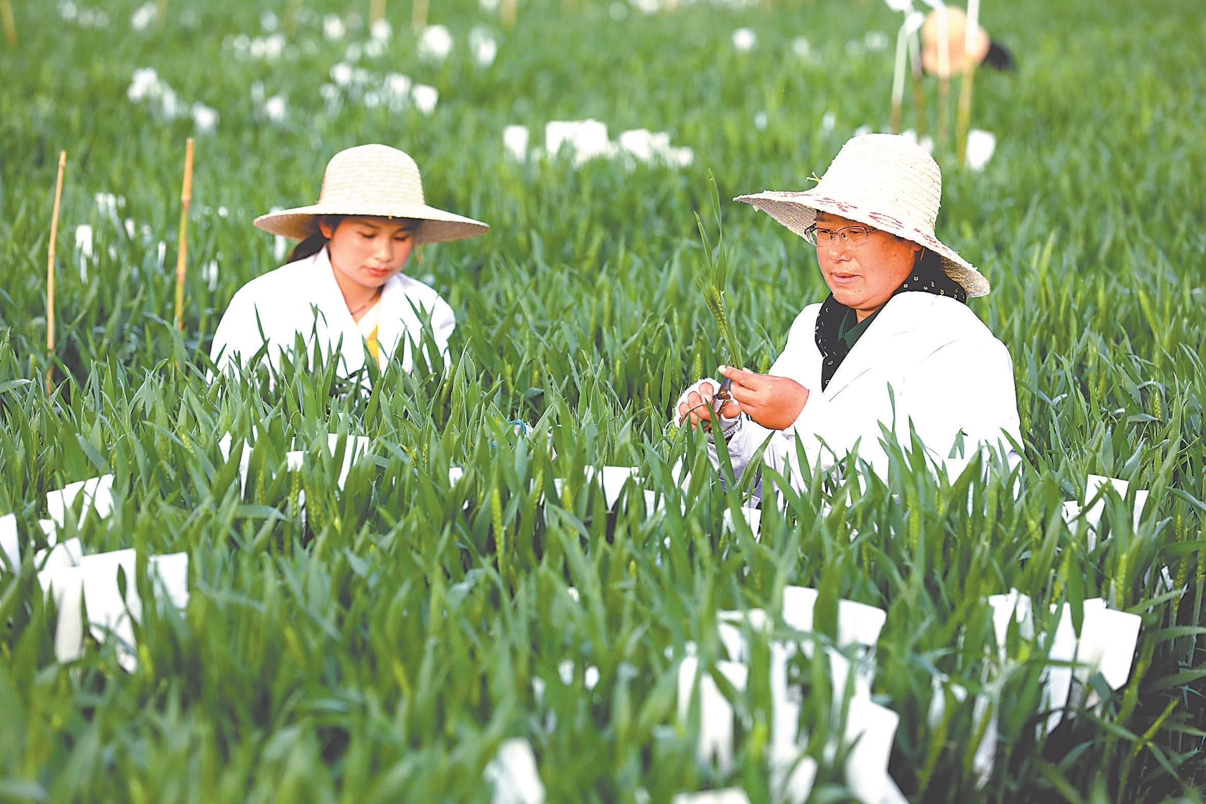 在淮北市濉溪县农业科研试验站五铺试验基地,农业科研人员与工人在进行小麦杂交授粉。(资料图片)本报通讯员 李 鑫 摄