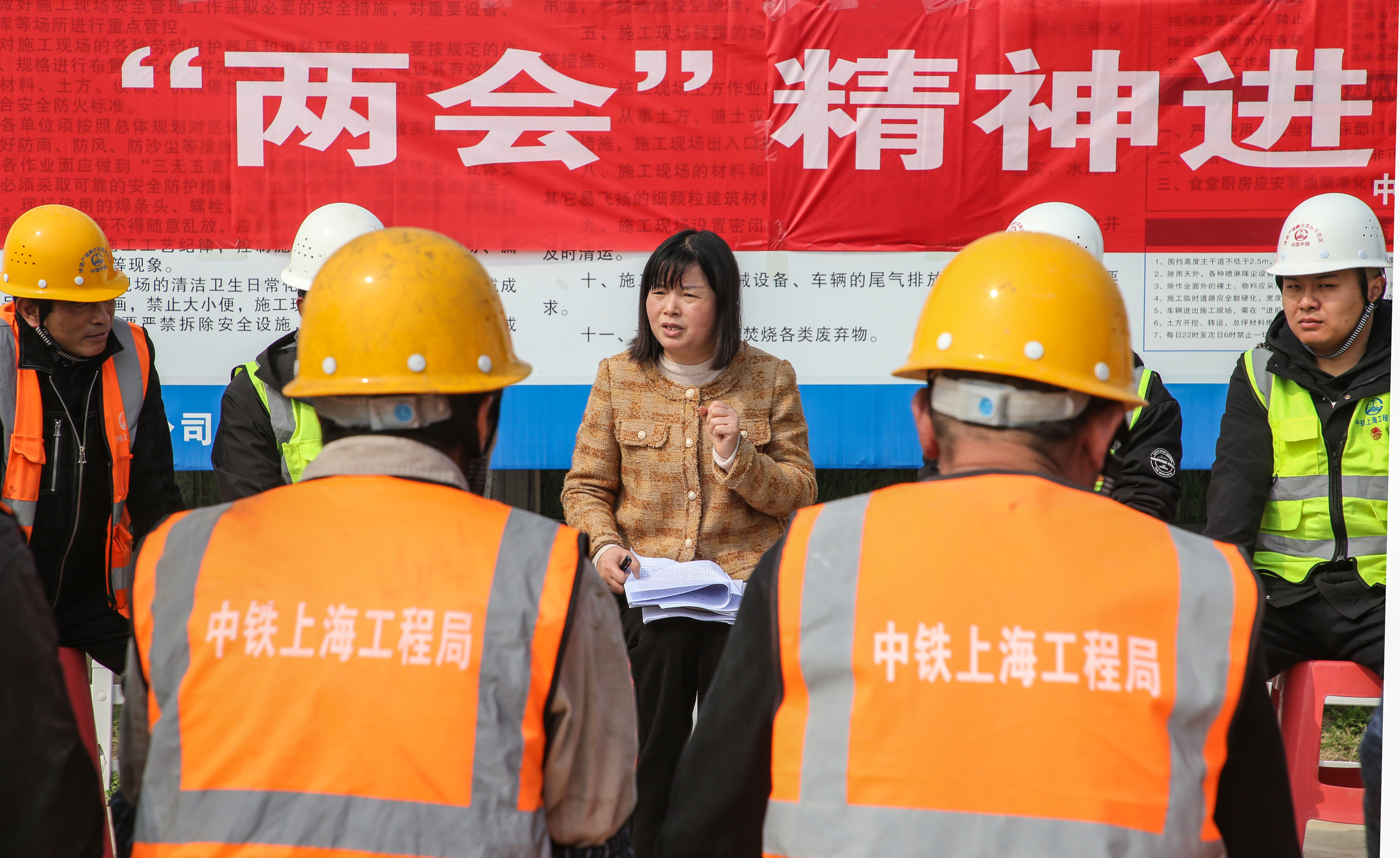 工地现场,工人们们围坐一起,聆听十四届全国人大代表、安徽省马鞍山市博望区博望镇永合村党总支书记陈小妹宣讲全国两会精神。陈小妹和大家分享自己的参会感受,并就“三农”工作、企业创新、人才就业等和人民群众息息相关的重点问题和大家进行互动和交流。