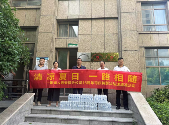 为传递公众爱心,践行社会责任,正值阳光人寿安徽分公司成立16周年之际,在分公司的统一部署下,8月20日,阳光人寿宿州中支来到环宇社区开展“清凉夏日一路相随”阳光人寿安徽分公司16周年司庆特别公益送清凉活动,为高温下的劳动者传递阳光关爱,凝聚社会力量。