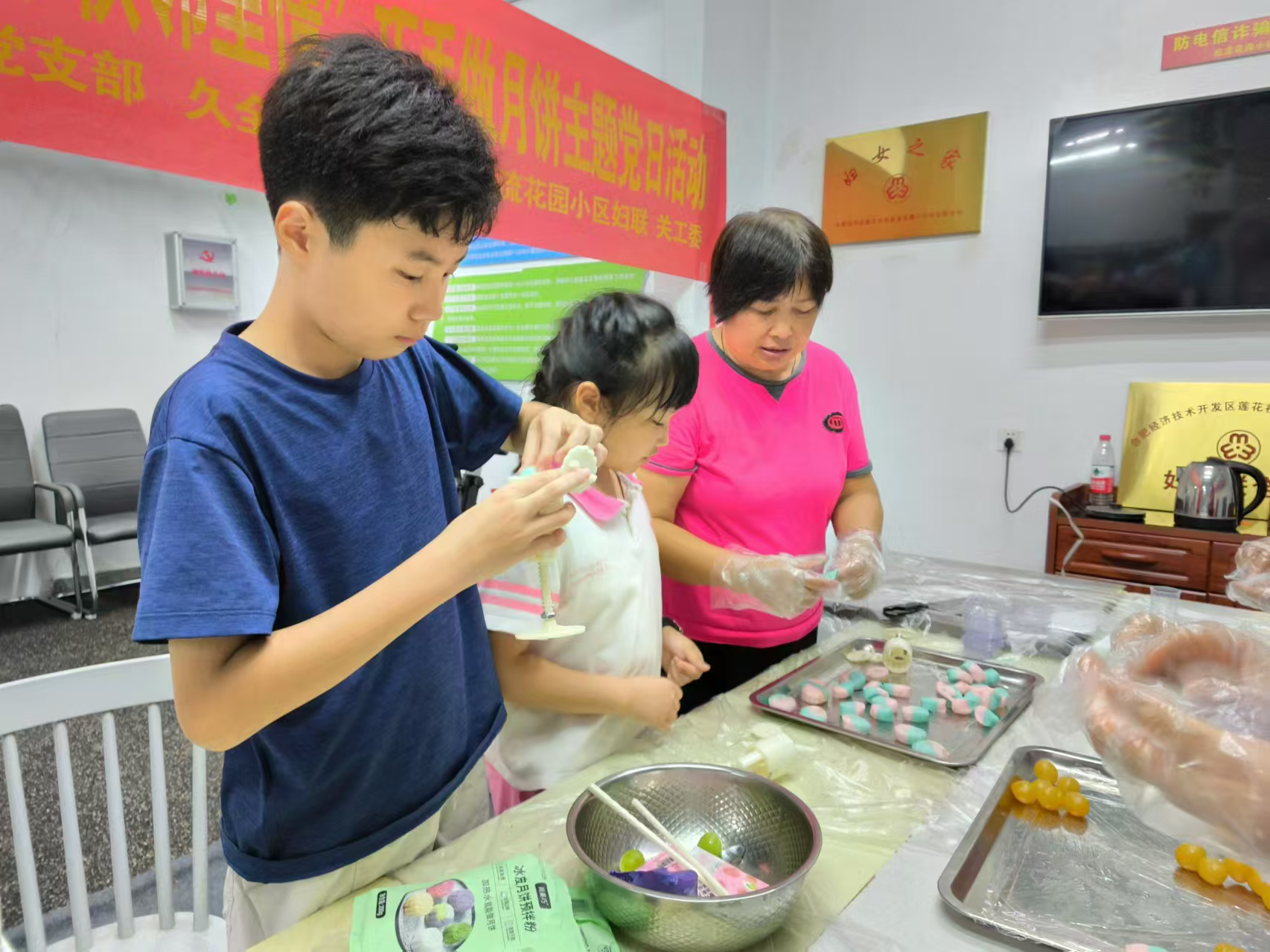 巧手做月饼。色彩斑斓的冰皮面团、香甜可口的馅料以及形式各样的模具,桌子上摆满了制作冰皮月饼的材料,大家分工合作,有的揉面团,有的称馅料,还有的负责压模成型,在制作过程中,大家互相交流着经验,分享着生活中的趣事,欢声笑语回荡在整个活动现场。随后,一个个精美的月饼在大家手中诞生,大家看到自己的“作品”兴奋不已,现场一片浓浓的中秋节日氛围。