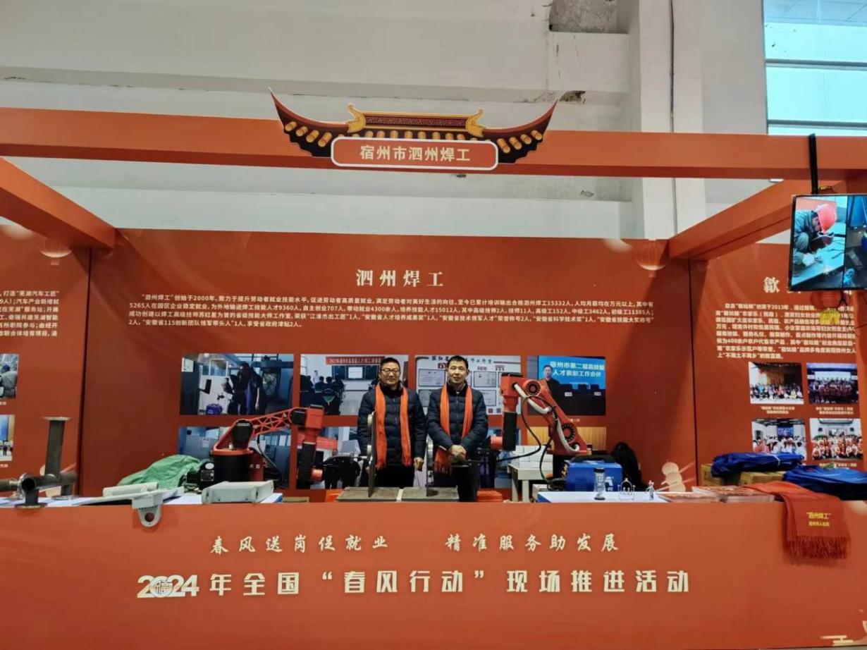 日前,“泗州焊工”劳务品牌在人社部举办的2024年全国春风行动现场推进活动中,凭籍动感十足的工业机器人焊接演示、丰硕的促就业成果和过硬的品牌荣誉,在众多劳动务品牌中脱颖而出,吸引了企业、求职者和群众的广泛关注,纷纷驻足咨询对接就业招聘工作。