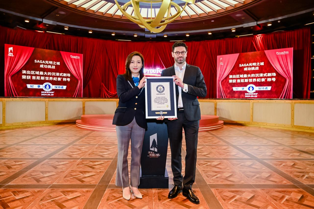 尤其值得一提的是,Puy du Fou普德赋SAGA光明之城在5月29日的活动当天,凭借12110.833平方米的室内演出区域面积,成功挑战并打破吉尼斯世界纪录,被吉尼斯世界纪录认证为“演出区域最大的沉浸式剧场”。