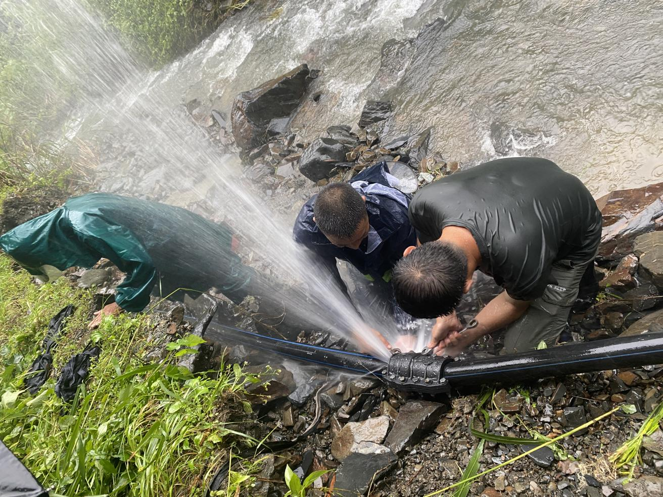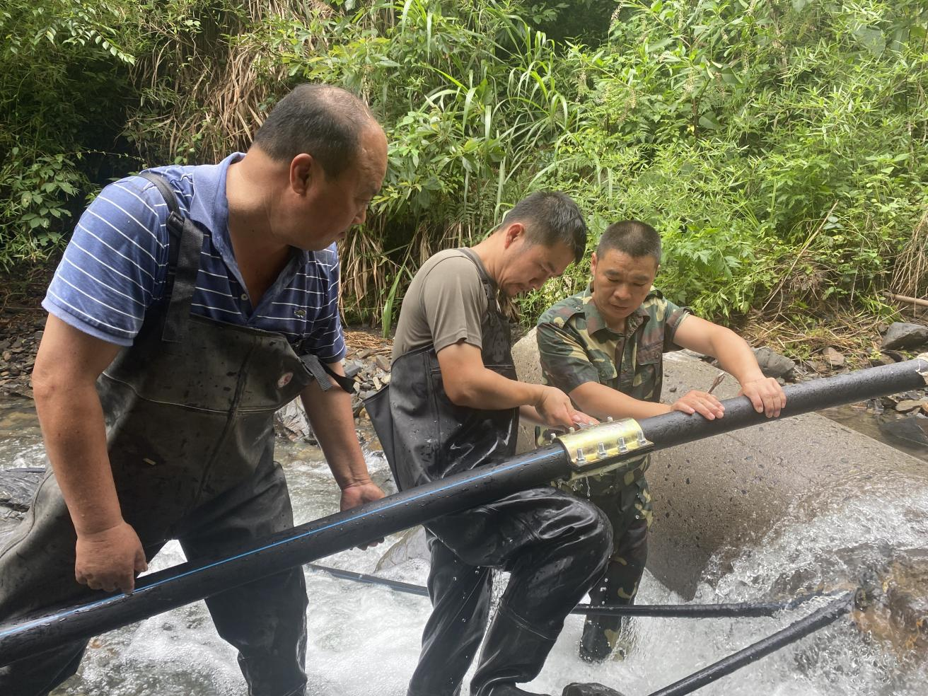 为了让村内群众尽快吃上安心、放心水,村党总支书记、主任徐建强带领叶明镜等4名村干部上山抢修水管。抢修的画面用心更暖心。原本仅用15分钟就可以走到的水源点,因暴雨后可能导致的泥土松动,抢修员们如今确需花费两倍的时间到达“战场”,水管损毁点在河道附近,宽约30米河道的急水夹着泥沙不停的翻腾冲打着他们的身躯,他们蹚水在河里开展抢修工作。泥沙灌满了雨鞋,倒出来继续干,一天半下来,他们的手和脚全都磨破了皮。大家轮番上阵抢修,齐心协力重新铺设了水毁的管道。