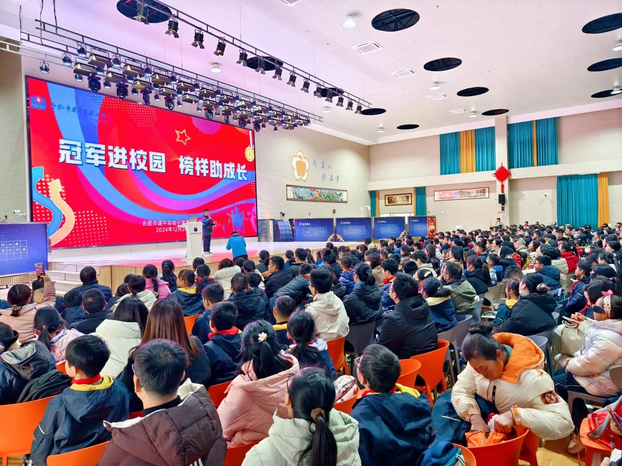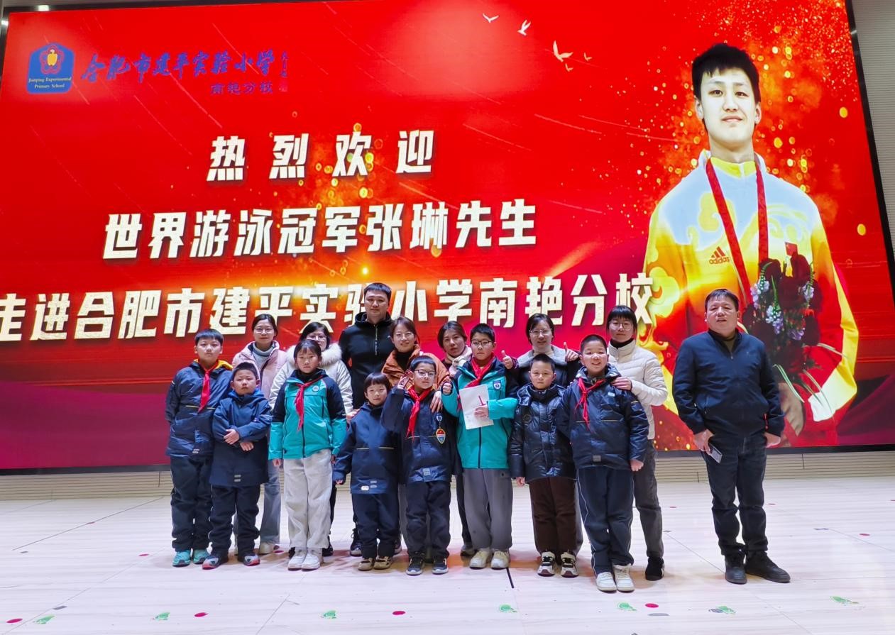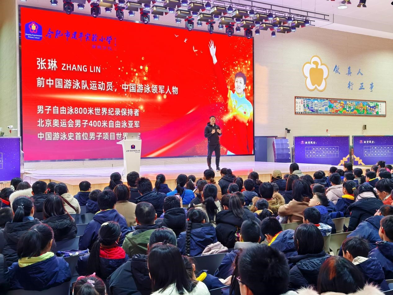 为了丰富校园文化生活,弘扬体育精神,激励学生们积极参与体育锻炼,同时加强家校互动,2024年12月24日下午,合肥市建平实验小学教育集团特举办“冠军进校园”主题活动,该活动由合肥市建平实验小学南艳分校承办。本次活动有集团四个校区共260余名学生及260余名家长参加,同时还特别邀请到了世界著名男子游泳运动员、世锦赛冠军、男子800米自由泳世界纪录保持者张琳,与学生及家长们面对面交流,分享运动经历与成功经验。