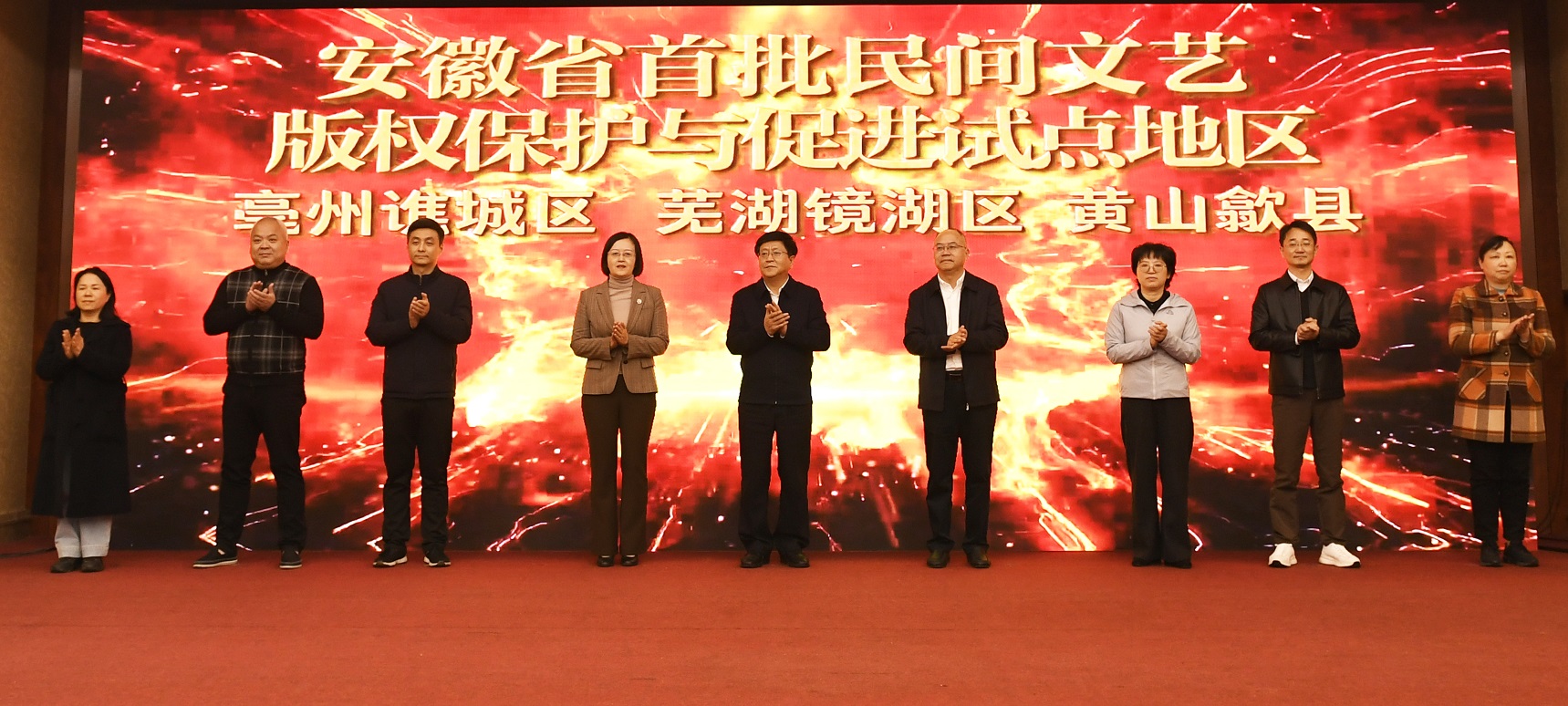 2024 年12 月5 日,安徽省首批民间文艺版权保护与促进试点工作启动仪式在2024 年安徽省版权工作培训班期间举办。省委宣传部在启动仪式上公布了入选安徽省首批试点工作的3 个县区名单,分别是亳州谯城区、芜湖镜湖区、黄山歙县。中宣部版权管理局副局长、一级巡视员汤兆志,省委宣传部副部长方晓利,以及省委宣传部版权管理处和3 个试点地区所在市县宣传部门负责同志共同点亮启动仪式大屏。