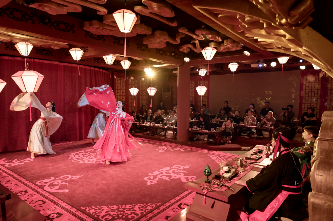 下半场场景转至大唐酒肆,李白领衔的斗诗互动将活动推向高潮。击鼓传花、即兴赋诗等游戏延续“建安风骨”主题,游客在轻松氛围中吟诵诗词、参与互动,与NPC共绘文化长卷。古琴与琵琶的清越之音、舞者水袖的翩跹之姿,与宴席上的亳州特色美食相映成趣,实现“文化可感知、历史可触摸”的沉浸体验。