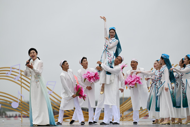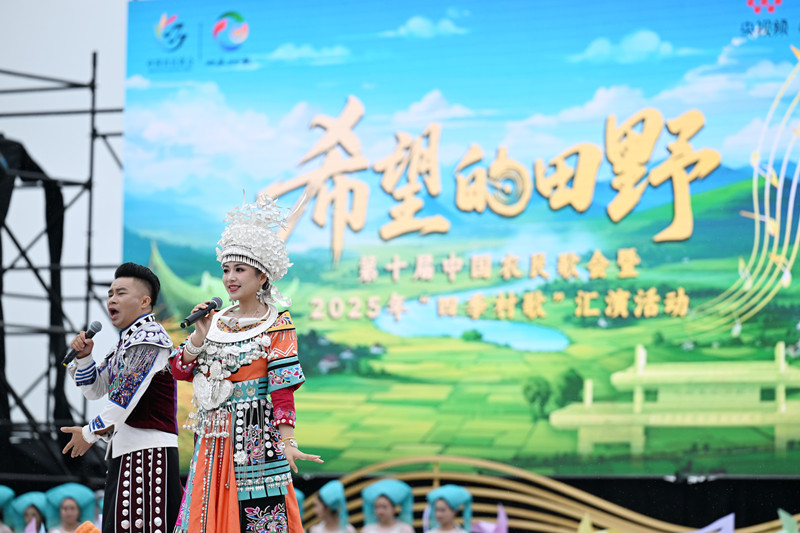 “在祖国辽阔的大地上,动人的歌声汇成海洋……”伴随着国家级艺术家阎维文高亢嘹亮的歌声,主题演出在开场歌曲《我们的祖国歌甜花香》中拉开帷幕。随后,“跨越·千里江山图”“聚力·东西南北中”“奋斗·敢为天下先”三大乐章主题表演依次呈现,来自全国的村歌代表、农民音乐人、国家级院团艺术家、明星嘉宾等齐聚一堂,用一首首动人的歌曲,共同唱响了乡村全面振兴的时代旋律,传递出新时代农民自信自强、建设美好家园的坚定决心。演出尾声,一曲《国家》温情唱响,为本届盛会画上圆满句号。