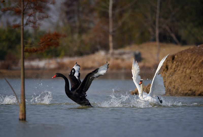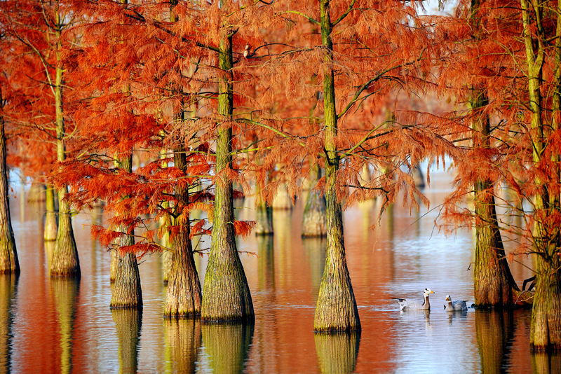 池杉林和里面嬉戏的鸟类。吴宗宝/摄