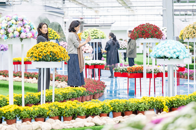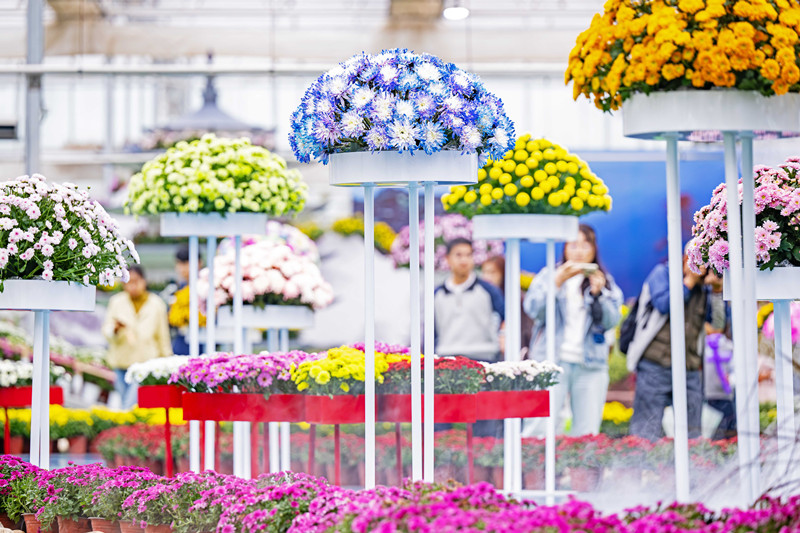 园区入口处的菊花画卷巧妙串联起滁州醉翁亭、南京长江大桥等地标,以花艺诉说着两座城市的山水情谊。园区内,3万余盆数万株菊花竞相绽放,传统菊、切花菊等品种争奇斗艳,色彩层叠、造型各异,让人流连于菊花的世界。50 亩户外花海中,波斯菊轻盈摇曳,硫化菊热烈奔放,百日菊层层攀升,各色菊花勾勒出灵动图案。四大主题展馆内,菊花造型设计融入《儒林外史》、走太平等本地文化元素,尽显 “儒林之乡” 的独特韵味。