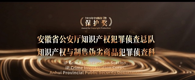 版博会期间,中国国家版权局与世界知识产权组织共同颁发了2025年中国版权金奖。安徽省版权局版权管理处、安徽省公安厅知识产权犯罪侦查总队知识产权与制售伪劣商品犯罪侦查科2家单位获此殊荣,创安徽版权领域历史最好成绩。中国版权金奖是中国版权领域最高奖项,也是中国版权领域唯一的国际奖项。