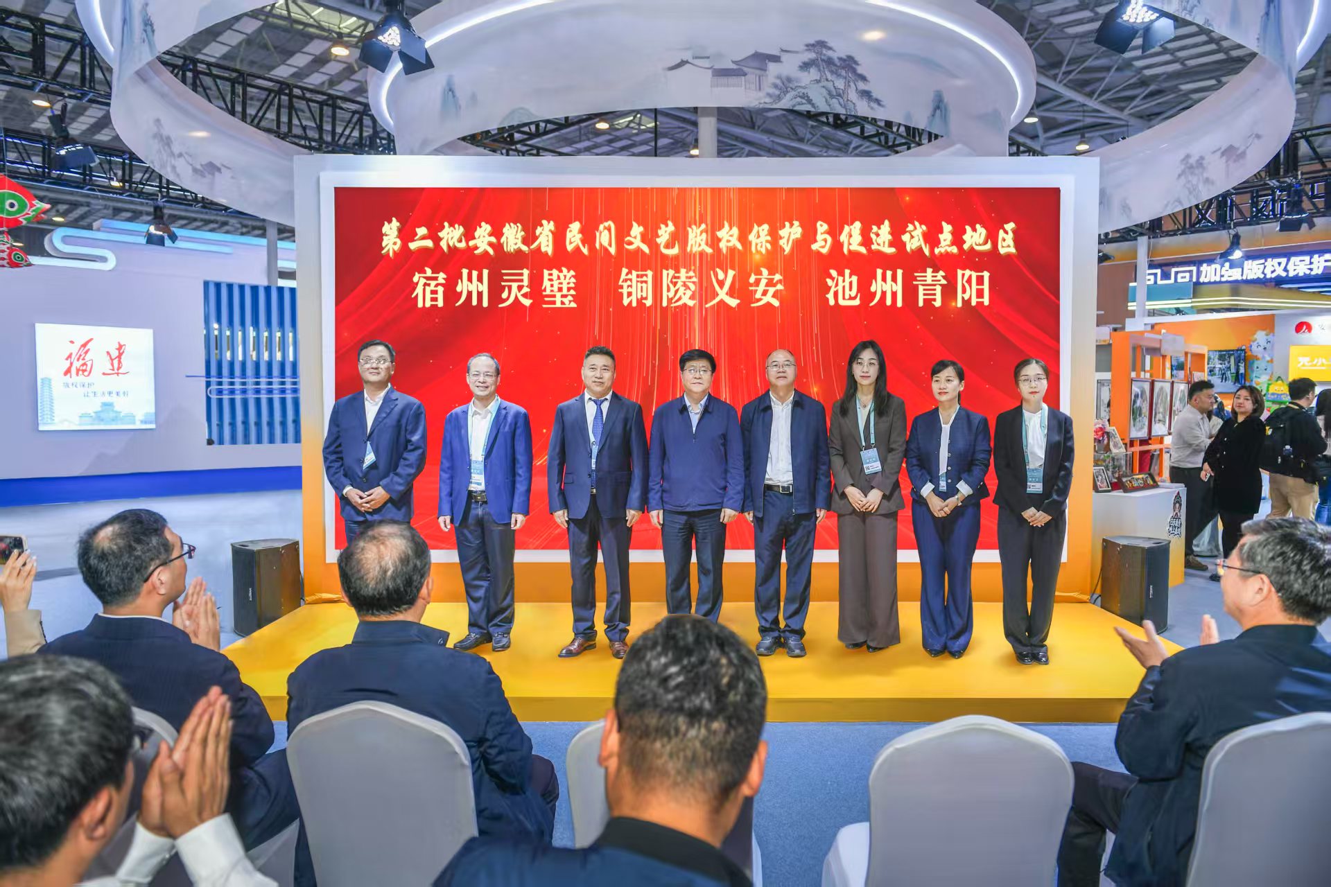 10月16日上午,第二批安徽省民间文艺版权保护与促进试点工作启动仪式在安徽展区成功举行。宿州市灵璧县、铜陵市义安区、池州市青阳县被正式确定为新一批试点地区。此举是安徽在前期亳州市谯城区、芜湖市镜湖区、安庆市怀宁县、黄山市歙县试点基础上,深化民间文艺版权保护与促进工作的关键一步。