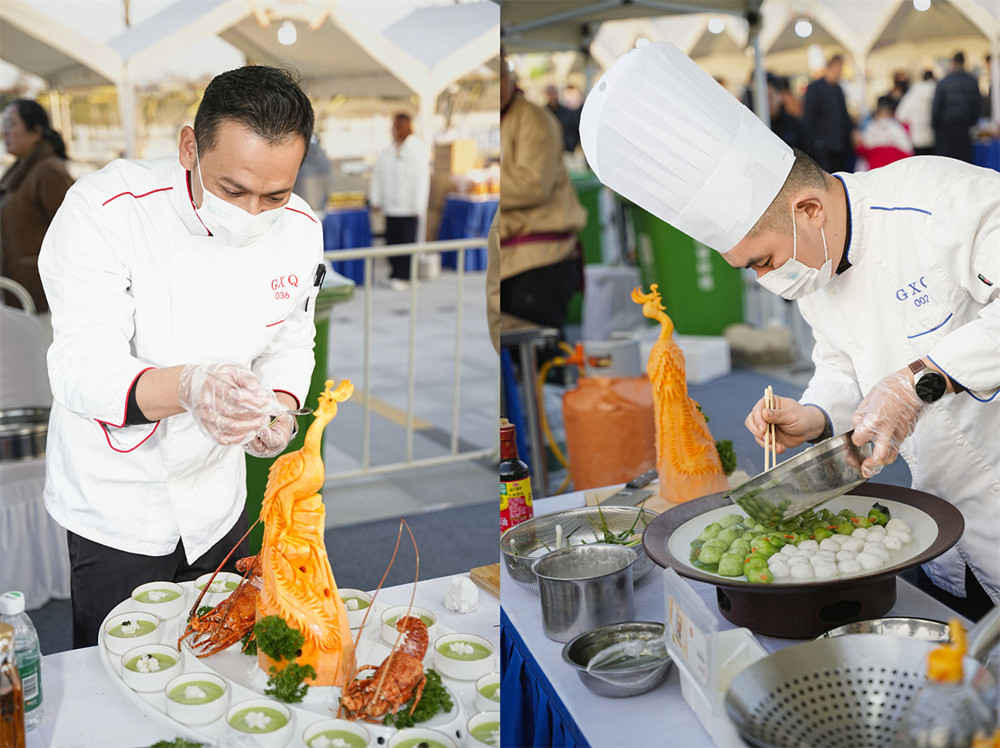 每个摊位前,缕缕香气诱人。风味独特、丰富多样的美食让人赞不绝口,垂涎欲滴,给人一种视觉与味蕾上的双重享受。切食材、调配料、煎炸炒……在厨师技能比赛区,来自50余家酒店的食神们正在进行激烈的厨艺比拼。大家纷纷拿出看家本领,精心烹制必选菜“珍珠翡翠白玉汤”以及“洪武宴”菜单中自己最拿手的自选特色菜,现场进行美食展示。锅碗瓢盆发出的噼啪声,像一首优美动听的乐曲,欢快轻盈……