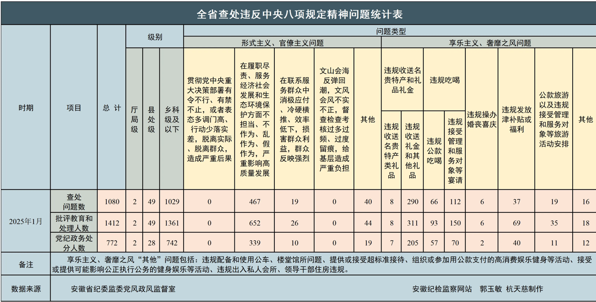 2025年1月,全省纪检监察机关共查处违反中央八项规定精神问题1080起,批评教育和处理1412人,其中给予党纪政务处分772人。