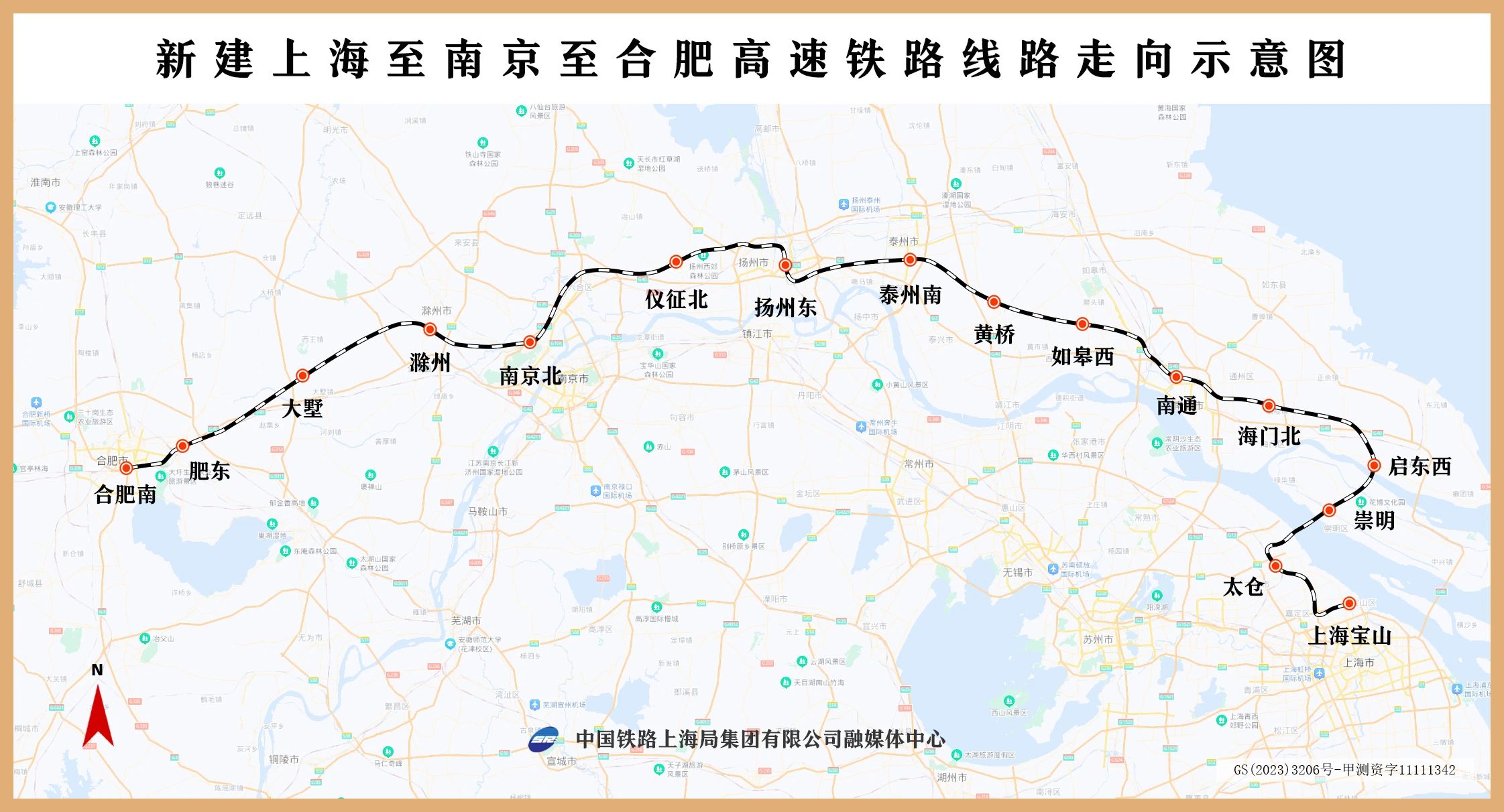 沪宁合高铁是沪渝蓉高铁的东段线路、国家“八纵八横”高速铁路网沿江通道的重要组成部分,起自上海市新建上海宝山站,经江苏省苏州市、南通市、泰州市、扬州市、南京市,以及安徽省滁州市、合肥市,接入既有合肥南站,线路全长约554公里(其中安徽段130.88公里),设计时速350公里,全线设16座车站(其中新建10座车站)。该项目建成后,将在上海都市圈、南京都市圈和合肥都市圈之间构筑一条高效便捷的快速通道,对于打造“轨道上的长三角”,优化沿长江地区铁路网布局,服务长江经济带高质量发展,推动长三角一体化高质量发展等具有重要意义。