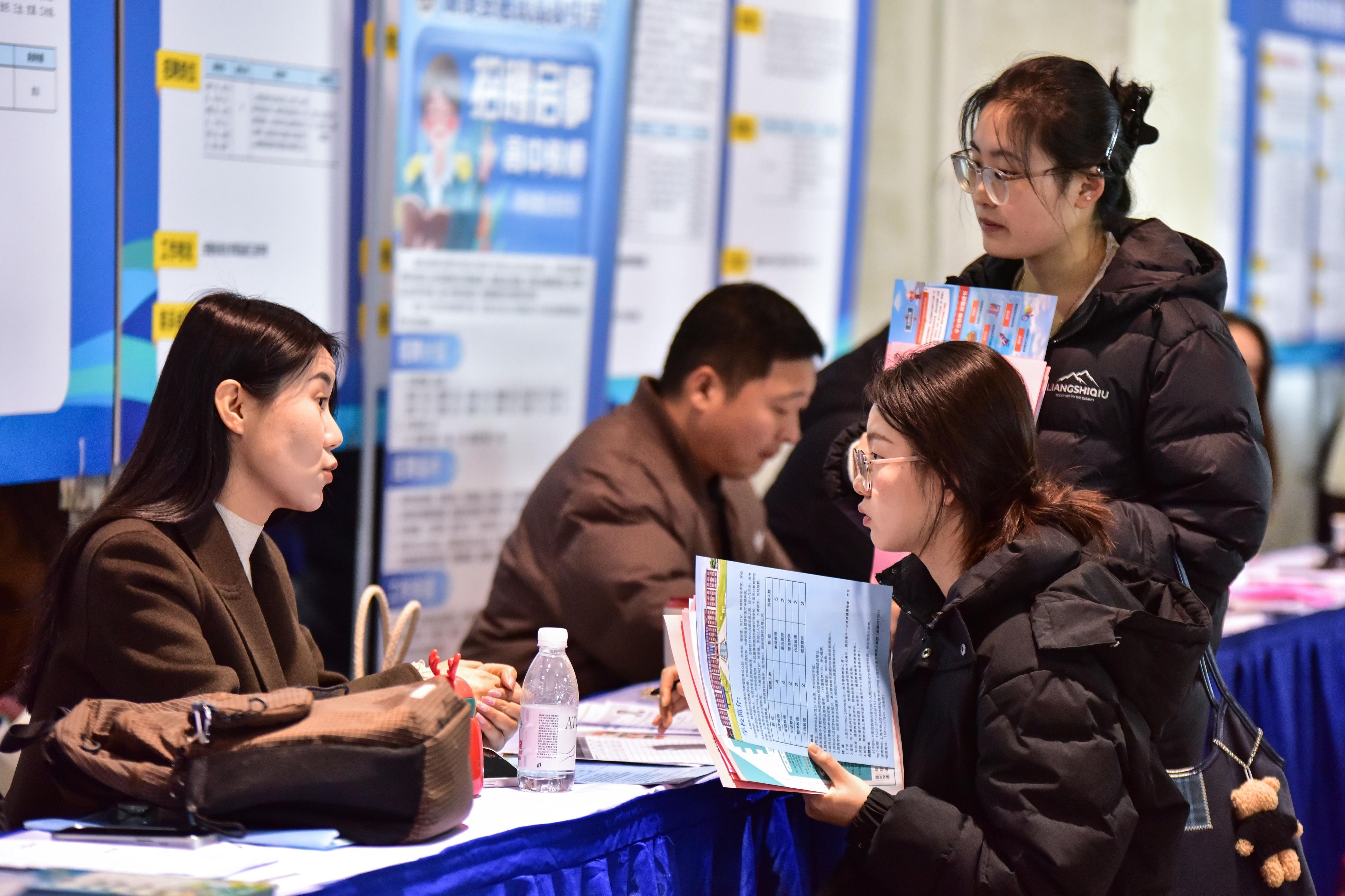 12月6日,阜阳市2025年“招才引智高校行”本地高校联合招聘会在阜阳师范大学体育中心举行。招聘会采用线上线下的方式同步进行,300余家优质单位参会,提供了6000多个就业岗位,吸引大批即将毕业的大学生咨询应聘。图为大学生与用人单位沟通。