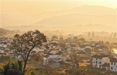 安徽省黄山市黟县宏村镇冬景如画,晨雾如轻纱般缭绕于白墙黛瓦的徽派民居之间,阳光穿透雾霭为村落染上柔和色泽,霜色点缀的田园阡陌相映,美不胜收。