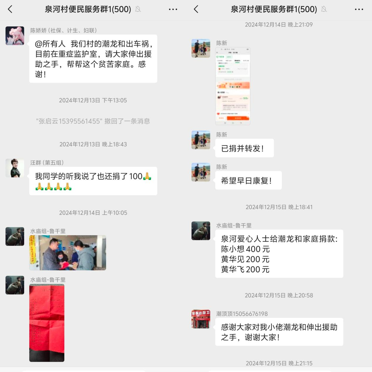 各方捐款解危难。2024年12月9日,村民潮龙和遭遇交通事故,被紧急送入ICU。他是家里唯一的劳动力,妻子和小女儿是精神残疾,生活无法自理,大女儿是先天智力障碍,勉强能做到半自理,家中经济来源只有潮龙和微薄的薪水和低保金。看着昏迷不醒的潮龙和以及ICU的高昂费用,潮龙和的亲戚来到村委会寻求帮助。得知此消息后,村“两委”第一时间开会讨论救助方法,帮助其申请临时救助,并将募捐信息发到村民群,镇村干部、党员带头捐款,村民们看到消息后,迅速响应,纷纷捐款,形成爱心接力。除了发动邻里捐款,镇村干部还广泛动员社会各界人士伸出援手,安排专人对每一笔捐款进行登记和公开。截至目前,已募集到善款 6 万余元,为潮龙和的治疗提供了重要的资金支持。