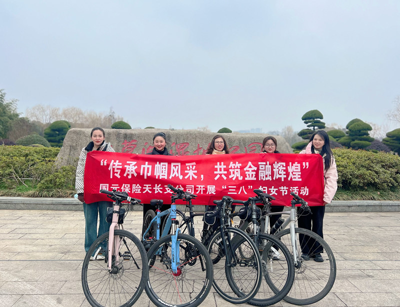 国元保险天长支公司在红草湖湿地公园组织女职工开展了以 “传承巾帼风采・共筑金融辉煌” 为主题的绿道骑行活动。
