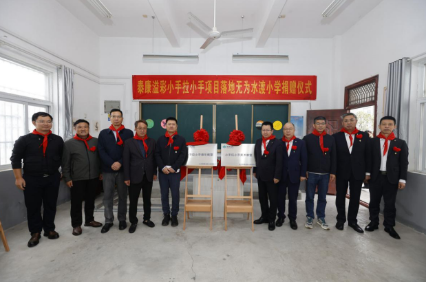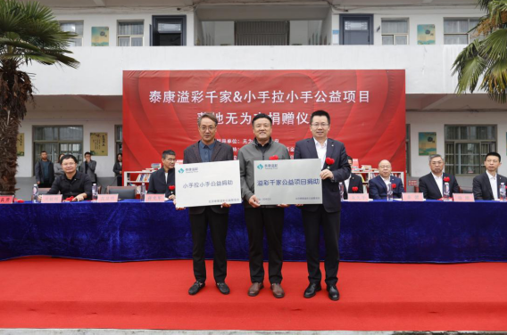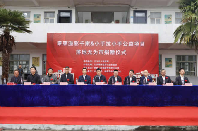 捐赠仪式上,泰康溢彩公益基金会向水渡小学和赫店养老服务中心分别授牌,标志着泰康“溢彩千家”和“小手拉小手”公益项目正式落地无为。