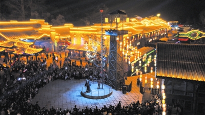 傩仙镇依托国家级非遗“池州傩戏”,打造了《傩王传奇》大型实景剧,融合声光电特效、武术与傩舞,呈现傩王传说。演出中,水爆、打铁花、空中飞人等特技表演让游客直呼“媲美电影特效”。夜幕降临时,点灯巡游仪式启动,演员身着古装、头戴傩面具,提灯穿梭于青石板巷,营造出神秘而浪漫的氛围。此外,火技表演、傩仙桥火焰刀等互动项目,让游客在体验中感受非遗魅力。