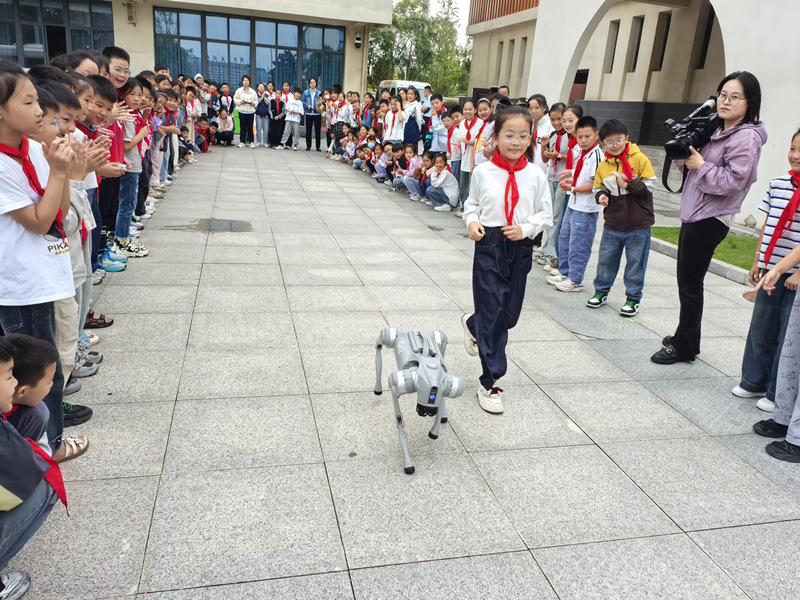 随着市科协副主席杨照东宣布活动启动,18 台机器人率先卡点《冲向巅峰》起舞,引来孩子们惊呼;随后两台机器狗表演跳跃、后空翻与互动,瞬间点燃现场气氛。“以前只在短视频里见,今天看机器狗打滚太酷了!” 城南小学五(4)班学生蒋慕言兴奋地说。
