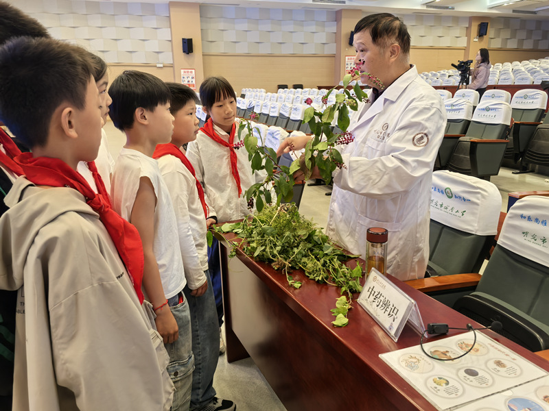 城南小学师生自编自演的科普情景剧《杏林春暖》随后登场,小演员身着汉服演示 “望闻问切”,融合 “传承” 与 “科技”。台下,市中医院志愿者带 10 余名小 “药童” 辨识药材,讲解 “明光艾草挥发油含量达 1.8%,超国标 0.3 个百分点”,让学生们频频点头。