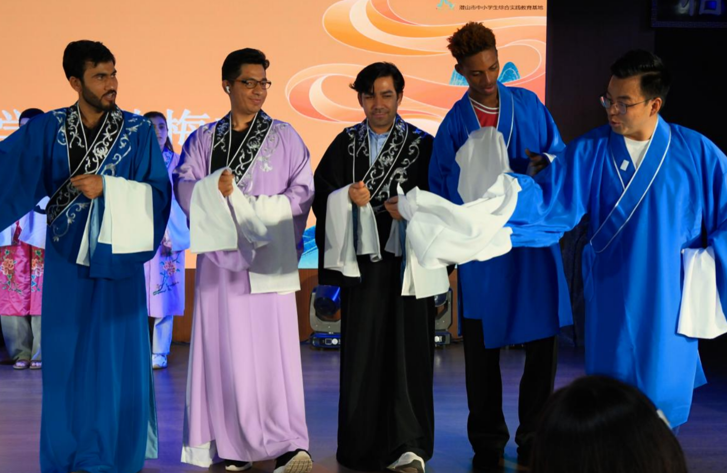 安徽天柱山研学旅行营地配备了18个主题活动室和6大主题场馆,开设了近200门课程,涵盖红色教育、传统文化、地质科普、科技创新等多个领域。在研学营地,在非遗传承人指导下,全球学子聆听非遗传承人的现场讲解,亲手体验制作《桑皮纸灯制作》、《巧手织非遗》等课程,近距离感受中国传统文化的独特魅力。来自越南的留学生表示:"亲手制作桑皮纸灯的过程让我感受到了中华文化的博大精深。"在京黄艺术研习所,国际留学生换上传统戏服,跟随非遗传承人一招一式学习黄梅戏经典曲目。从“树上的鸟儿成双对”的婉转唱腔,到手势、眼神的精准拿捏,学子们用不太熟练却充满热情的表演,诠释着对中国戏曲文化的理解。全球学子在这里学唱黄梅戏、体验戏服身段,以沉浸式学习感受中国戏曲的独特魅力,成为中华文化国际传播的生动注脚。