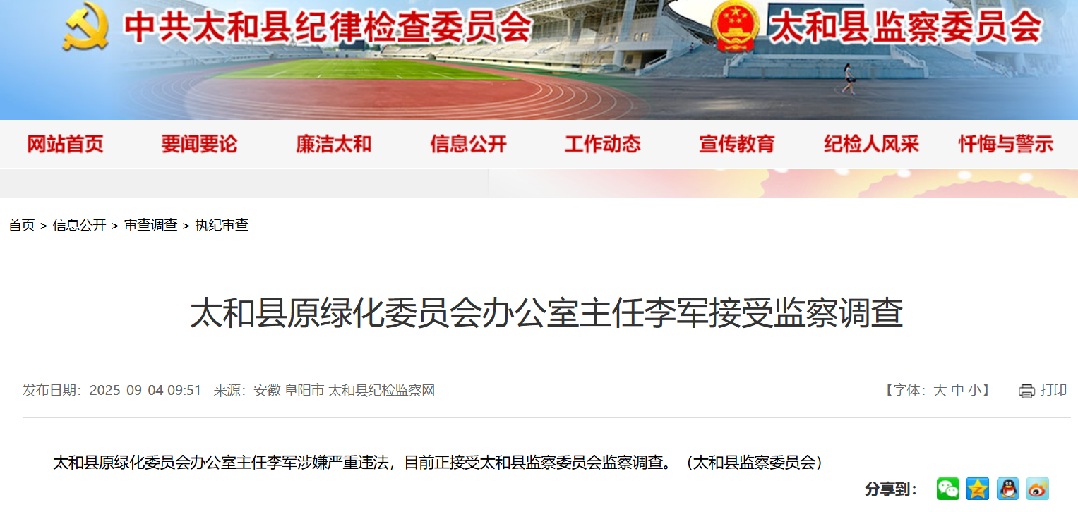 9月4日,据太和县纪检监察网消息,太和县原绿化委员会办公室主任李军涉嫌严重违法,目前正接受太和县监察委员会监察调查。(太和县监察委员会)