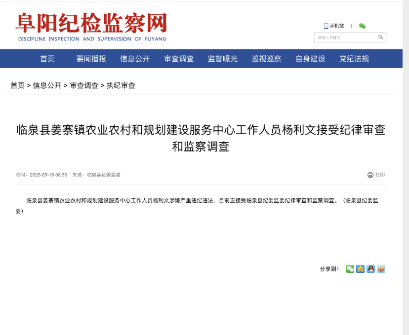 9月18日,据阜阳纪检监察网消息,临泉县姜寨镇农业农村和规划建设服务中心工作人员杨利文涉嫌严重违纪违法,目前正接受临泉县纪委监委纪律审查和监察调查。(临泉县纪委监委)