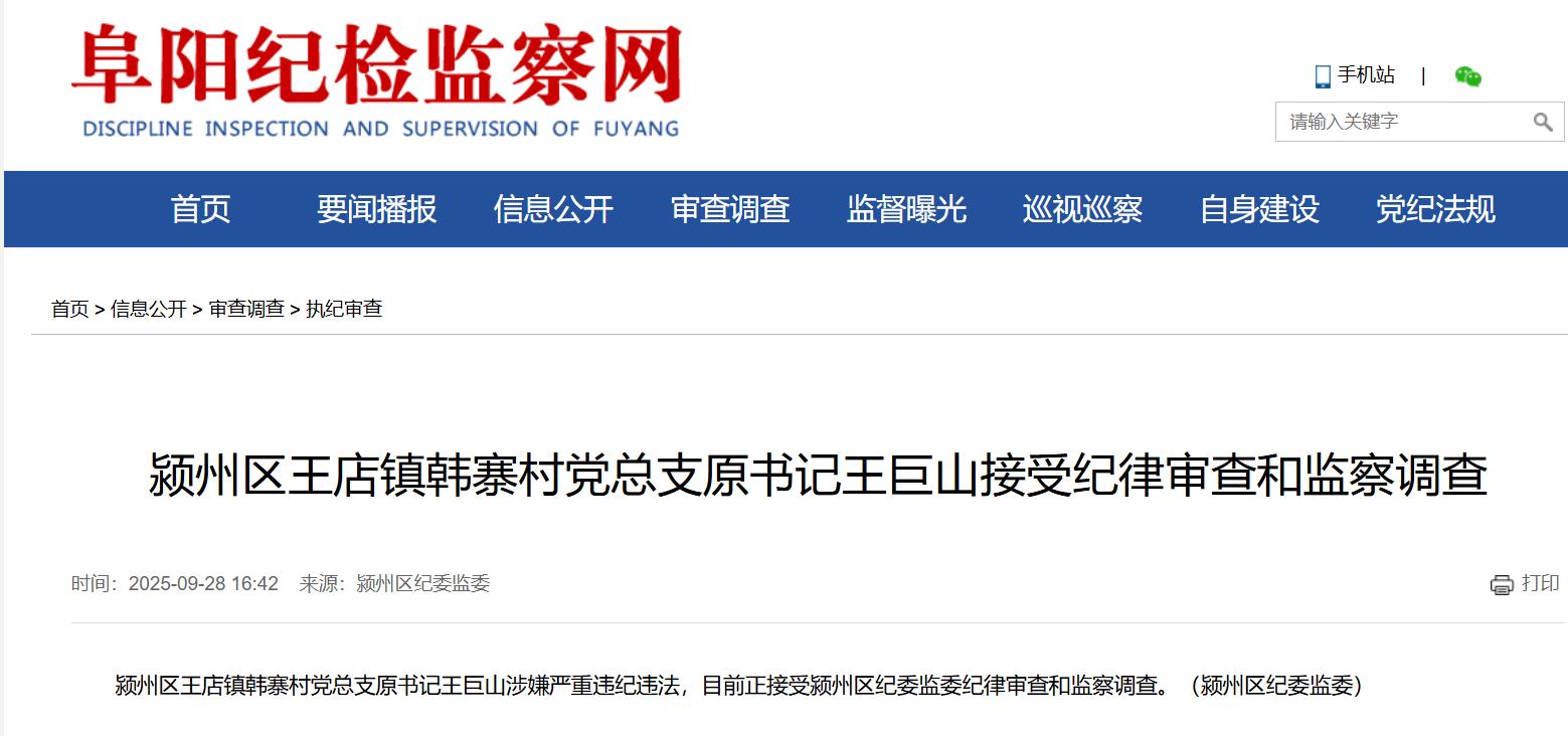 9月28日,据阜阳纪检监察网消息,颍州区王店镇韩寨村党总支原书记王巨山涉嫌严重违纪违法,目前正接受颍州区纪委监委纪律审查和监察调查。(颍州区纪委监委)
