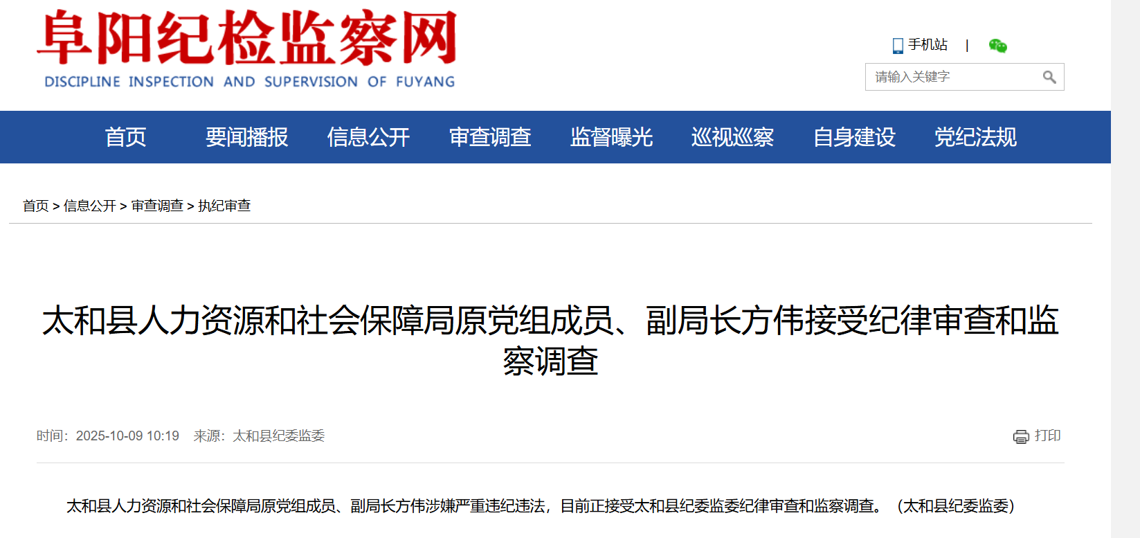 10月9日,据阜阳纪检监察网消息,太和县人力资源和社会保障局原党组成员、副局长方伟涉嫌严重违纪违法,目前正接受太和县纪委监委纪律审查和监察调查。(太和县纪委监委)