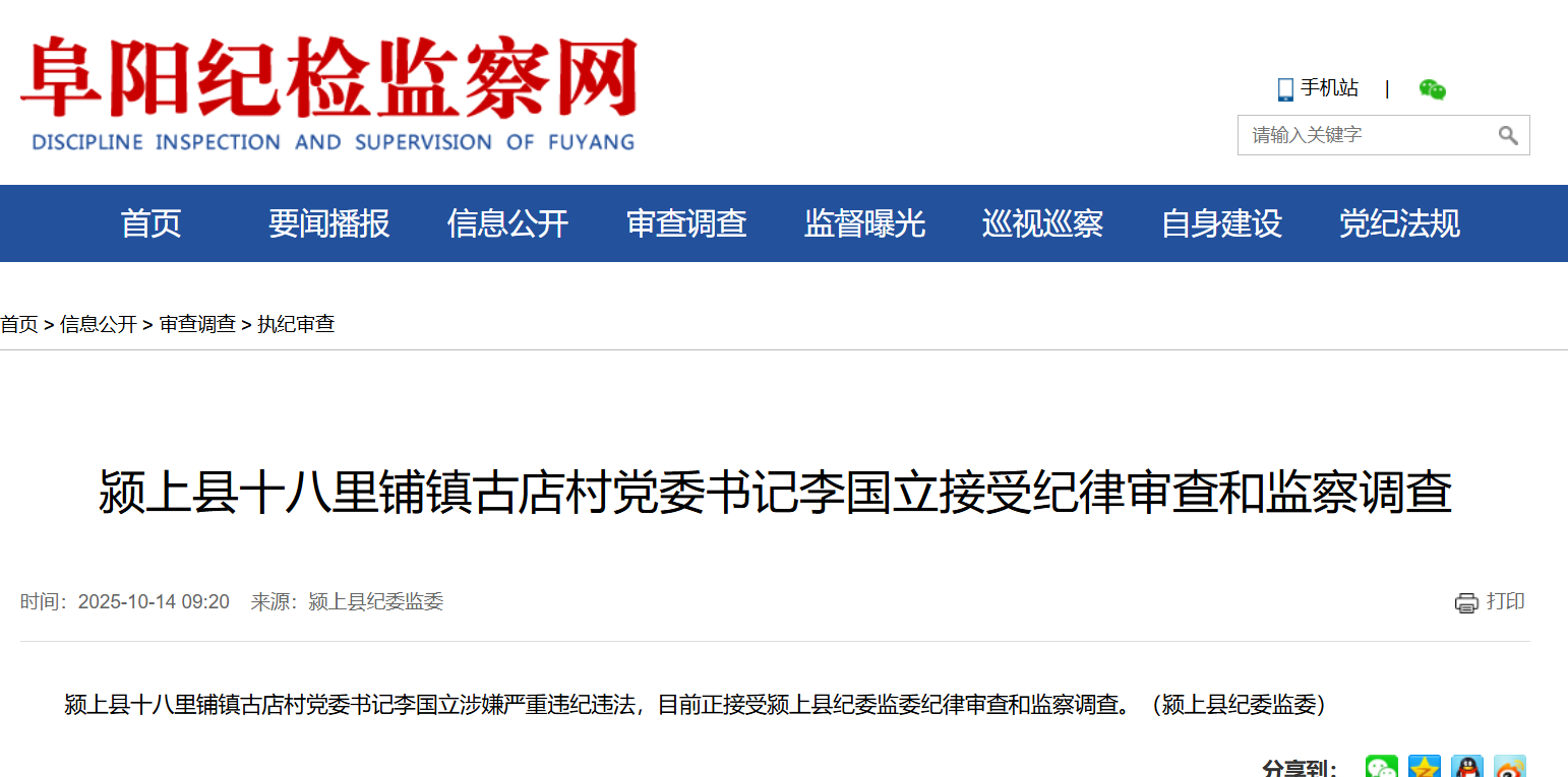 10月14日,据阜阳纪检监察网消息,颍上县十八里铺镇古店村党委书记李国立涉嫌严重违纪违法,目前正接受颍上县纪委监委纪律审查和监察调查。(颍上县纪委监委)