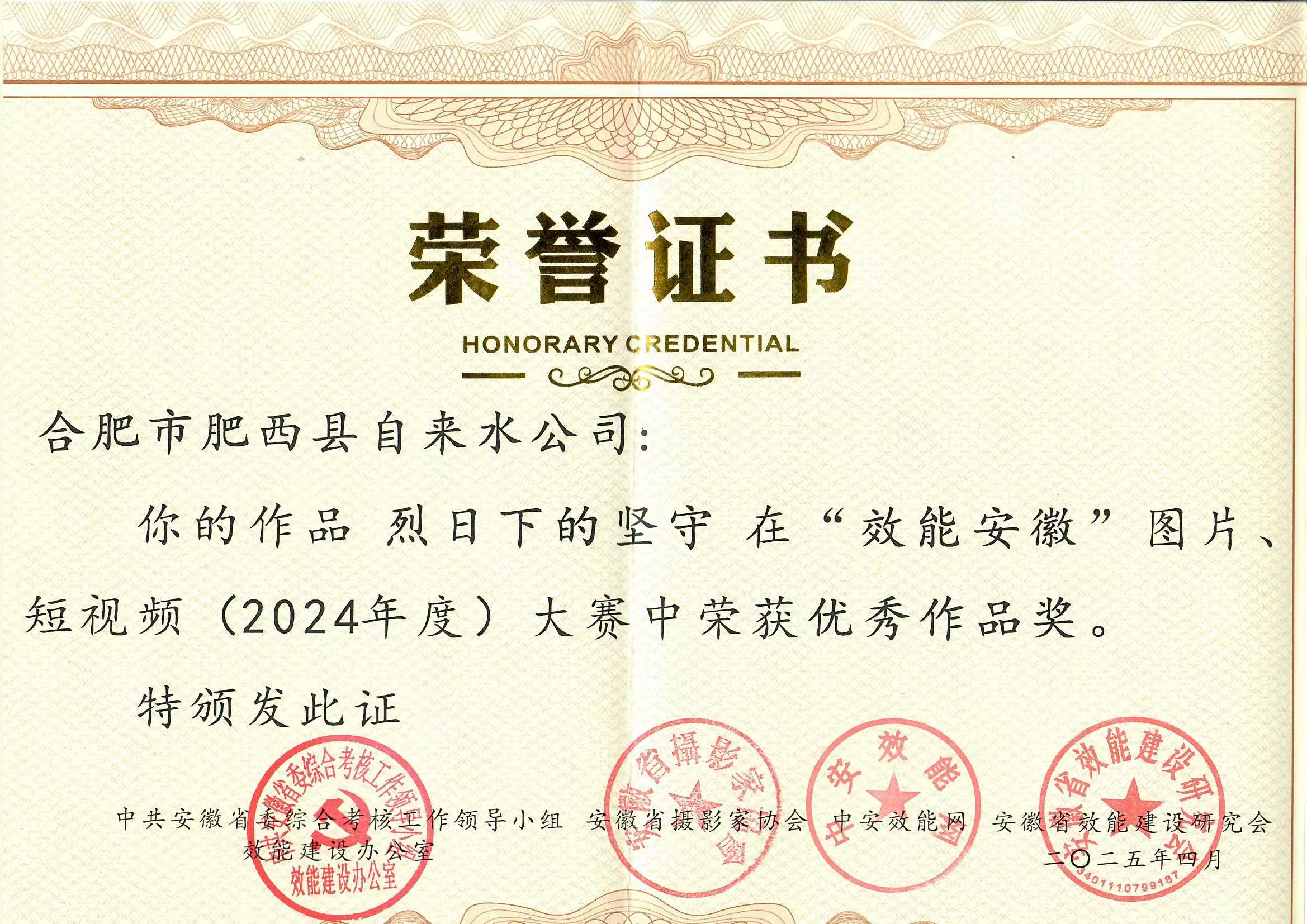 日前,在中共安徽省委综合考核工作领导小组效能建设办公室指导、安徽省新媒体集团主办的第二届“效能安徽”图片和短视频大赛中,肥西自来水有限公司职工报送的摄影组图及短视频斩获优秀作品奖。该作品生动展现了公司供水抢修(服务)中心党员先锋队的日常工作场景,包括夏季高温巡查管网、24小时应急抢修及“红马甲”志愿服务等画面,彰显了效能建设在保障供水安全、提升服务质量中的核心作用。借此契机,公司号召全体职工进一步强化效能意识,深化效能实践,共同推动企业高质量发展。