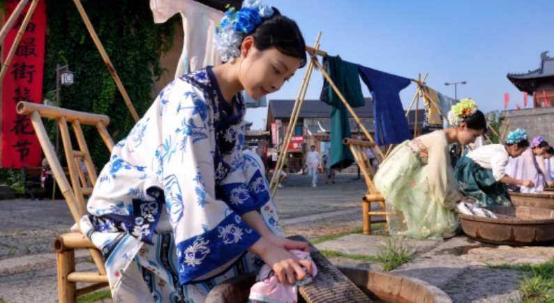 娉婷浣衣女赛出“邻里情”。作为大暑节的经典项目,今年的洗晒节在浣衣场景演绎中融入了“竞赛”元素,增添无限乐趣。水花飞溅间,撮城广场再现“捣衣砧杵响,万杆披锦绣”的壮阔景象。