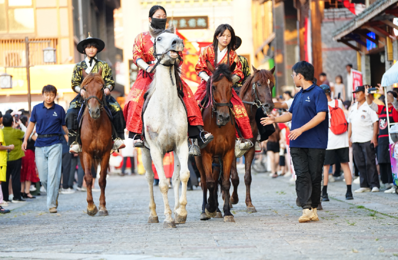 古装巡游震撼焕新。作为本届重头戏和撮街经典项目,古装巡游在展现形式上大胆创新。巡游现场,三匹战马昂首开道,禁卫军、汉服簪花女、舞龙队、扇子舞、花船队伍首尾相连,浩浩荡荡,从撮城广场出发,经楼前街,入水街,转楼前东街,边走边演。飒爽英姿、灵动飘逸、神龙摆尾、流光溢彩的盛景,与古色古香的街景相得益彰,吸引游客争相跟随拍照,再现千年风华。