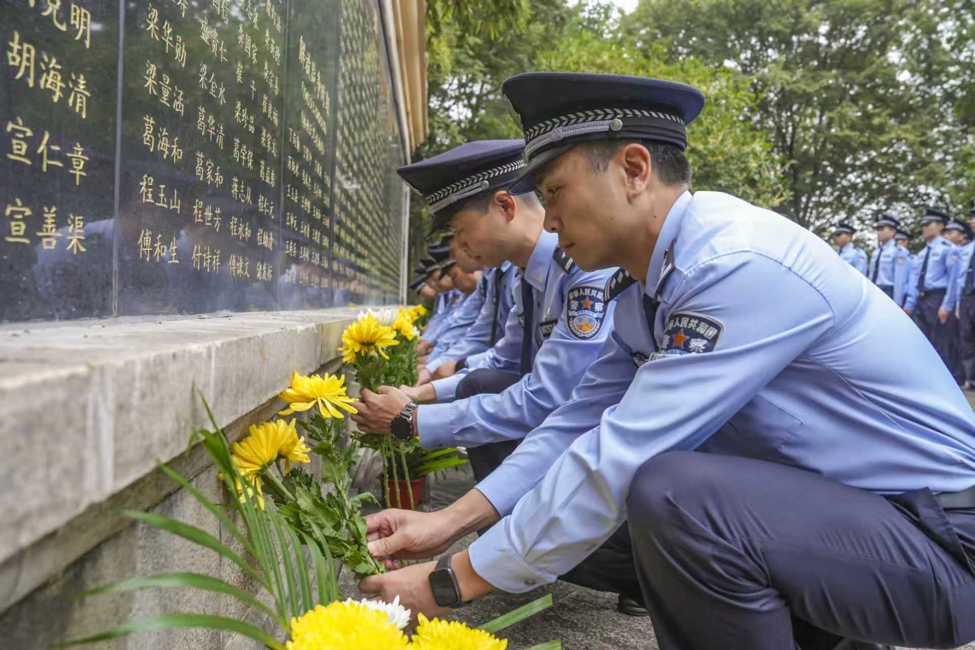 默哀结束后,全体人员列队行至烈士英名墙,由民警代表向烈士敬献鲜花,全体人员庄重敬礼。最后,大家绕行烈士墓,依次敬献鲜花,瞻仰烈士事迹,回顾革命精神,深刻感受革命英烈为民族独立和人民解放献出宝贵生命的大无畏精神。