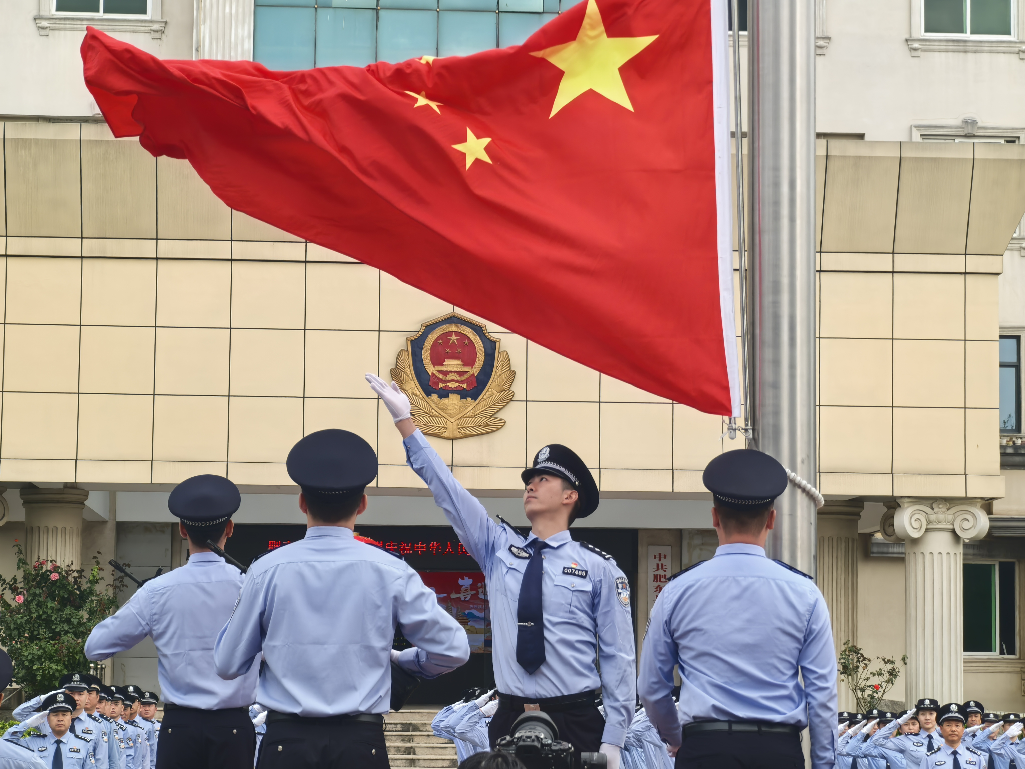 为热烈庆祝中华人民共和国成立76周年,10月1日上午8时30分,肥东县公安局组织民警辅警在县局大楼开展升旗仪式和重温入警誓词活动,激励全体民警辅警坚定理想信念,铸牢忠诚警魂,以更加强烈的政治担当忠实履行新时代使命任务。(东公宣)
