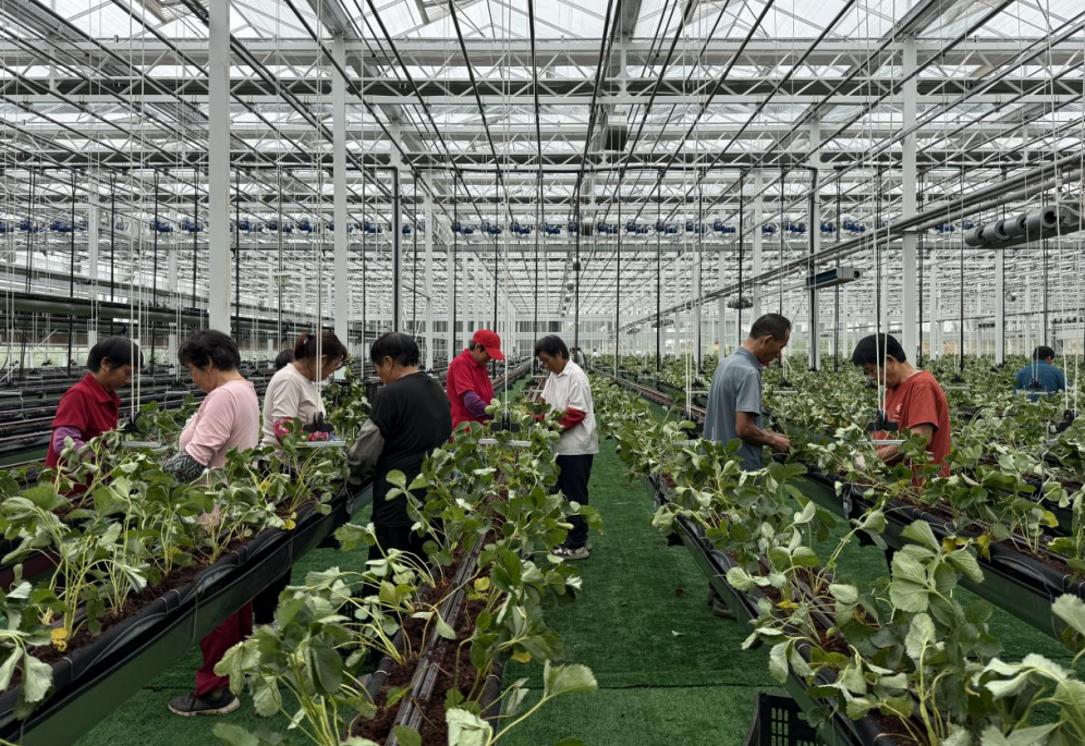 今年,周楼村引进5.8万株越冬草莓,涵盖了红颜、香野、粉玉和黑珍珠等,具有抗病虫害能力强、果实口感好、产量高优势的品种。在6400㎡的高科技智能温室大棚内,空中草莓立体种植架整齐悬挂,工人们动作娴熟地进行着起苗和定植工作,一株株嫩绿壮实的草莓苗被小心翼翼地栽种到钢架种植槽基质中,整齐划一,焕发着勃勃生机。村书记王学祥介绍:“通过大棚温控、滴灌技术、科学水肥管理和绿色病虫害防治等现代化农业技术的综合运用,能为草莓生长营造最适宜的环境。这批精心栽下的草莓苗,预计在11月底至12月上旬就能成熟上市。”