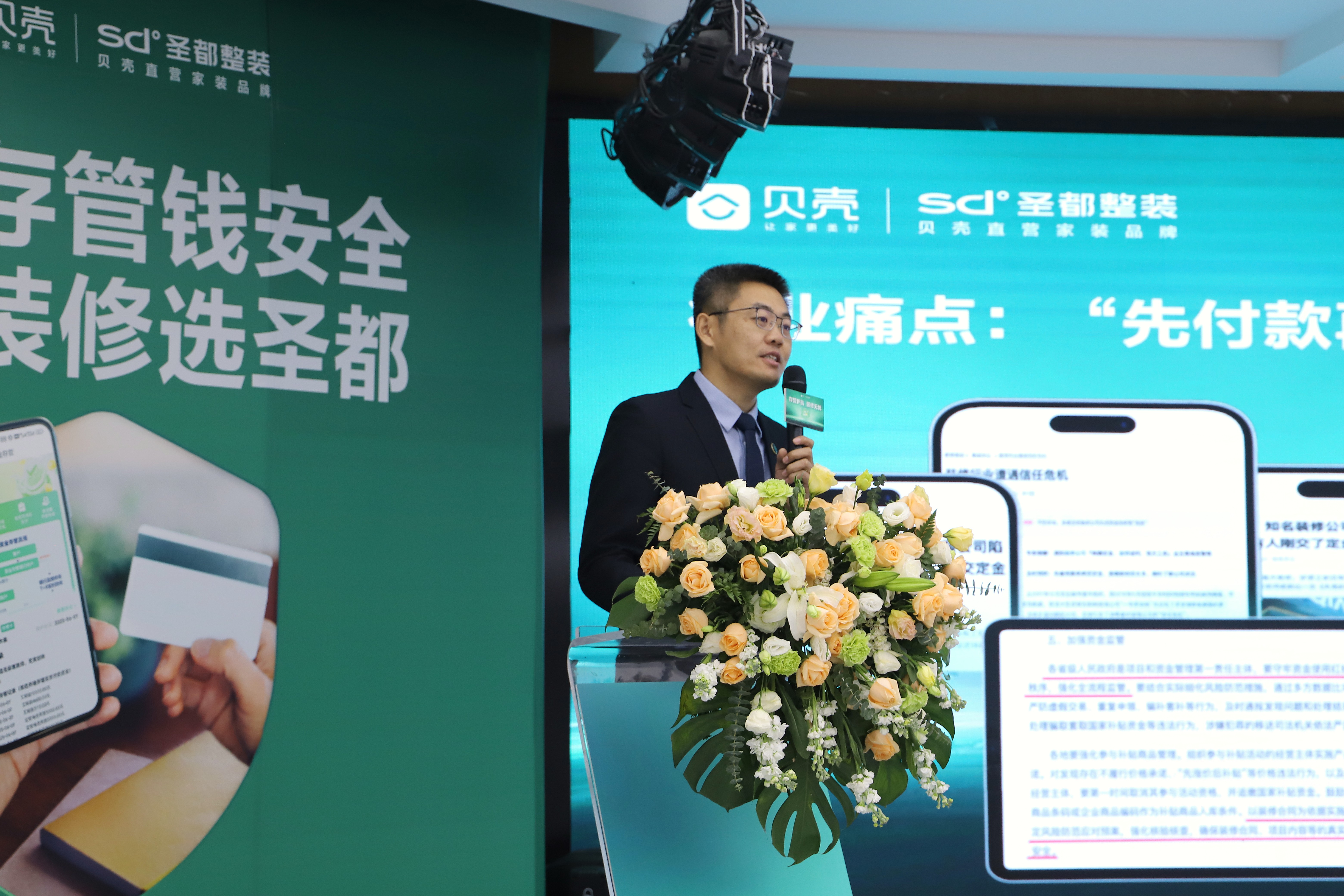在发布会的核心环节,贝壳整装品质与策略中心业务策略部负责人王金鹏先生上台进行了资金存管方案的详细介绍及阶段性成果汇报。他通过具体数据和案例,生动演示了资金存管的全流程运作机制。