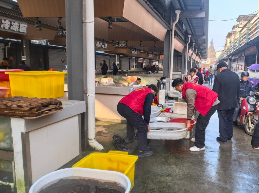 聚焦民生场景,农贸市场焕新颜。近日,官亭镇官亭社区的志愿者们深入农贸市场水产、生鲜经营区域,协助商户规范货品摆放、维护经营秩序。在水产摊位前,他们帮助搬运水产、劝导解决占道经营问题;在肉类、蔬果摊位旁,引导商户落实“门前三包”,让农贸市场既有烟火气,又有整洁度,切实提升群众买菜的“幸福感”。