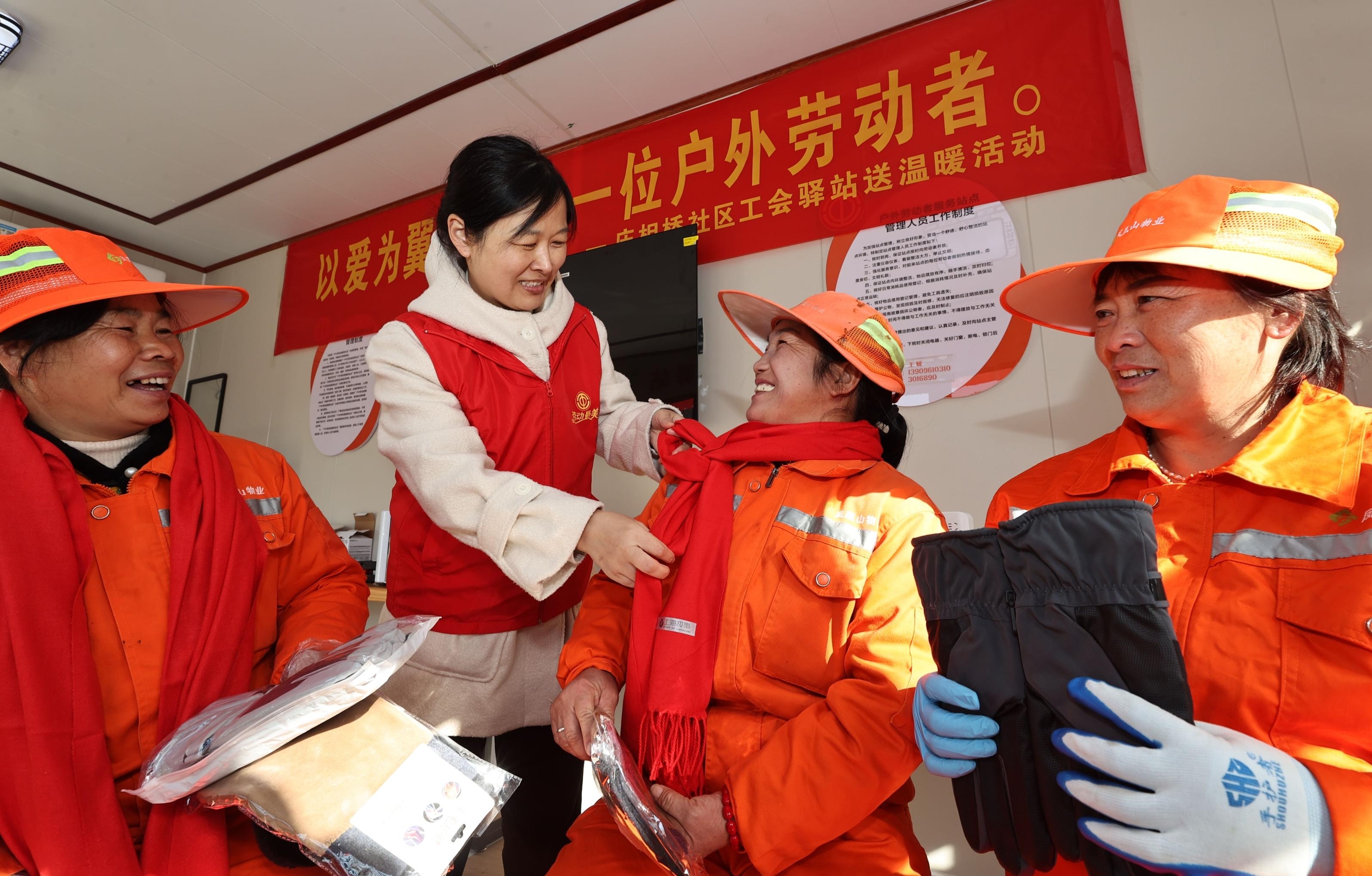 近日,在淮北市相山区庆相桥社区工会驿站,相山区总工会工作人员向环卫工送上护膝、手套、围巾等冬季防护用品,确保户外劳动者平安温暖过冬。本报通讯员 张锋 刘晴 摄