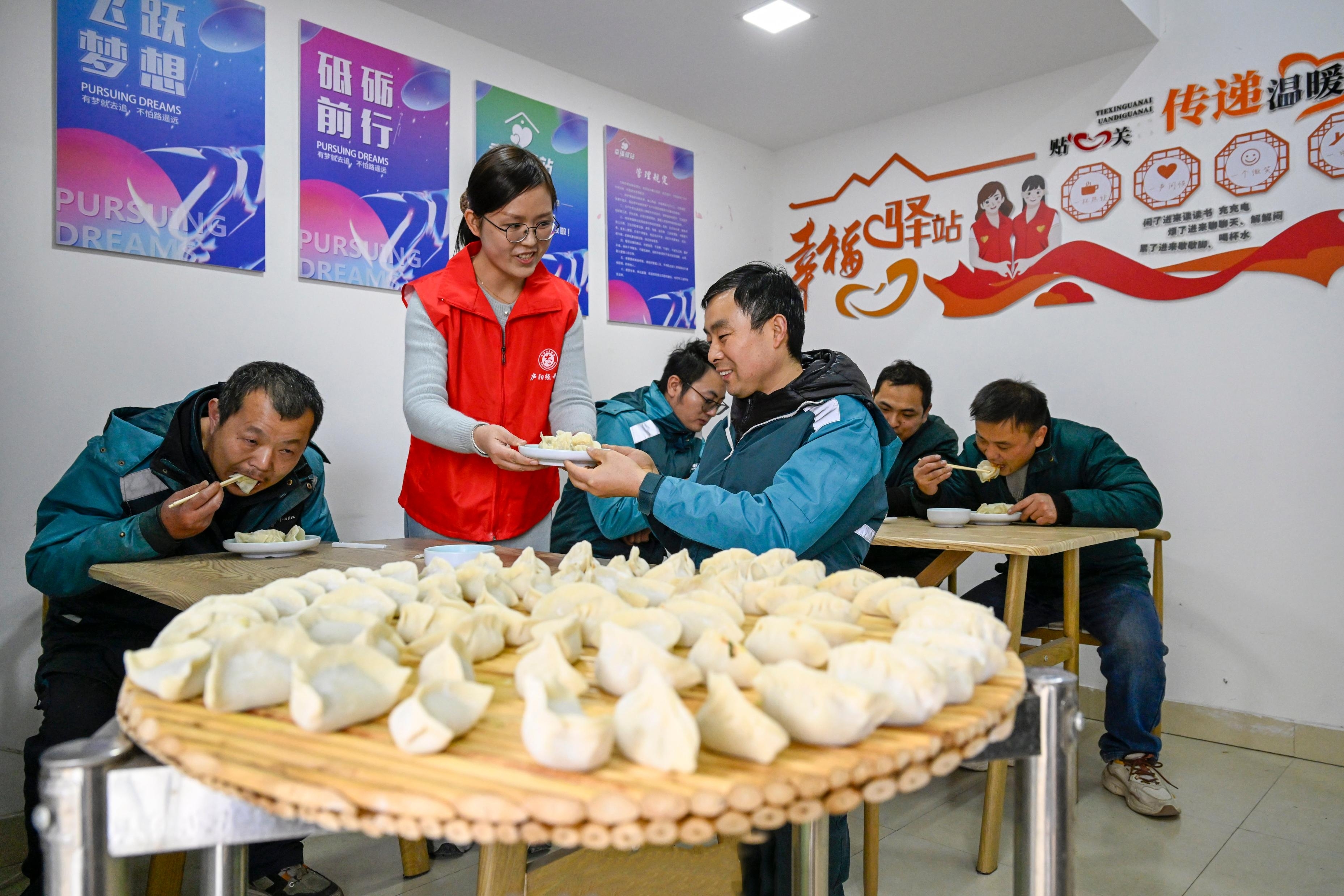 11月27日,在合肥市庐阳区林店街道工会驿站,快递小哥正在品尝水饺。冬季到来,当地工会为辖区新就业群体提供手套、保温杯等礼包,“温暖”新就业群体。本报通讯员 赵明 摄