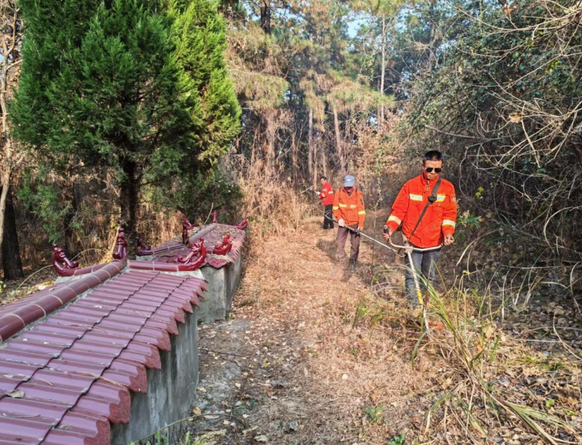 当前天干物燥,墓区周边杂草繁茂,祭祀用火易引发火情。行动中,队员们手持镰刀、割草机等工具,按照“一割、二清、三运”原则,对散落坟头及林缘地带的易燃可燃物进行全面清理,重点开辟防火隔离带,确保可燃物与墓区保持安全距离。针对偏远分散墓区,队员们徒步排查,做到清理无死角。