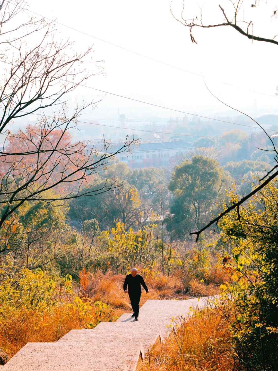 沿着步道缓行,两侧山林叠翠,季节仿佛在这里慢下了脚步——红叶未落尽,松柏仍苍翠,一层染着一层,交织成静谧而斑斓的画卷。偶尔遇见拍照的游人,或是独自静坐的徒步者,彼此点头一笑,共享这份山间的宁静与开阔。