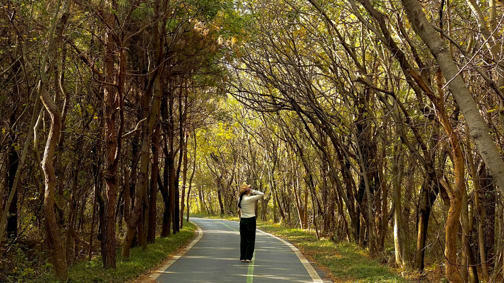 这里没有喧嚣,只有蜿蜒的小径、渐黄的枝叶与静静相伴的山影。踩着沙沙的落叶往前走,听风穿过林梢的低语,看光斑在脚下轻轻晃动,时光仿佛被拉长,杂念也随之消散。