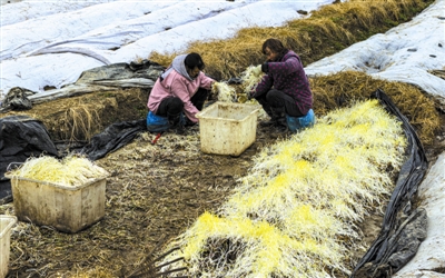 12月22日,合肥市庐江县东顾山街道马店村徐业武种植家庭农场,菜农正在采收、分拣特色蔬菜——芹芽。马店芹芽历史悠久,目前全村158户村民种植芹芽面积1200多亩。马店村民以传统的古老模式种出的芹芽脆嫩、口感佳,赢得市场青睐,现已获得国家发明专利、国家地理标志和绿色无公害认证。芹芽亩产1200公斤左右,亩产值2万余元,仅此一项每年可为村民带来近2000万元的收入,马店也成为远近闻名的芹芽专业村。