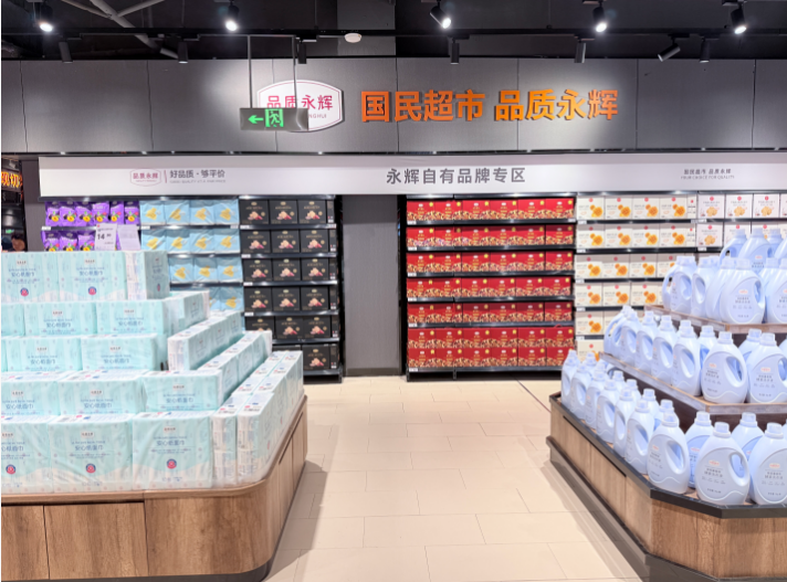 特色专区提升体验:门店设立“胖东来商品专区”,陈列DL粮油、啤酒、果汁、毛巾等近60支特色商品。同时,永辉自有品牌矩阵如品质永辉橙汁、洗衣液、酱油等多支商品,以高质价比满足家庭核心需求。食百区还增设“魔童专区”,聚焦亲子与潮玩。