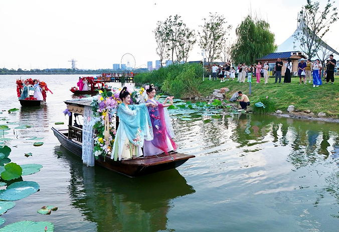游客在百莲百荷景区游玩、观看水上表演