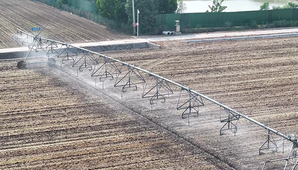 干旱持续,土壤含水量不足40%。在埇桥区国家级现代农业示范区内,两台百米级水肥一体机昼夜作业,12小时可浇500亩。