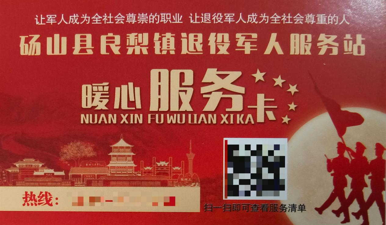 一张名片大小的卡片,正面印着镇退役军人服务站的联系方式和服务清单二维码,背面罗列着各村服务站电话——在良梨镇,这张“暖心服务卡”被退役军人亲切地称为“贴心宝”。它不仅是服务信息的“集合站”,更是良梨镇退役军人服务站用心用情做好退役军人工作的生动缩影。